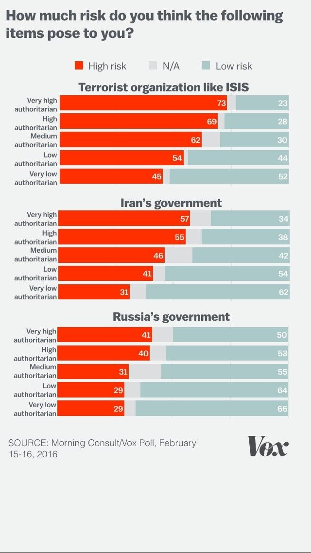 Khảo sát của chúng tôi cho thấy những người có khuynh hướng chuyên chế thường sợ những mối đe dọa từ nước ngoài như ISIS, Nga và Iran. Các nhà nghiên cứu đã chỉ ra rằng đây là những mối đe dọa mà người ta có thể gắn cho những cái mặt người; một tên khủng bố đáng sợ hay một giáo sỹ Iran. Những người không có khuynh hướng chuyên chế thường không sợ những mối đe dọa này nhiều bằng nhóm đối nghịch với họ. Ví dụ, 73% trong số những người được đánh giá là có khuynh hướng chuyên chế cao tin rằng những nhóm khủng bố như ISIS là “những rủi ro rất lớn” đối với họ, nhưng chỉ 45% trong số những người được đánh giá là có khuynh hướng chuyên chế thấp có niềm tin tương tự. Ngược lại, những mối đe dọa thường nhật như tai nạn xe cộ lại không đáng sợ lắm với những người có khuynh hướng chuyên chế.