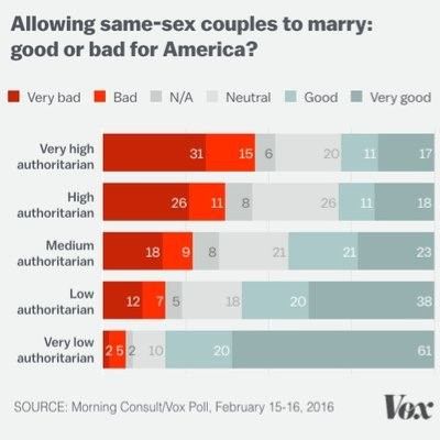 Rất đáng chú ý là phản ứng của những người không có khuynh hướng chuyên chế đi theo hướng ngược lại. Những người không có khuynh hướng chuyên chế thường đánh giá hôn nhân đồng giới là “tốt” hoặc “rất tốt” cho đất nước.