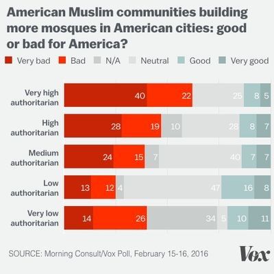 Một tỷ lệ ngất ngưởng 56.5% số những người có khuynh hướng chuyên chế cho rằng việc người Hồi giáo xây thêm nhiều giáo đường là “tệ” hoặc “rất tệ” cho đất nước. Chỉ 14% số những người có khuynh hướng chuyên chế cho rằng việc xây thêm giáo đường này là “tốt” hoặc “rất tốt”.