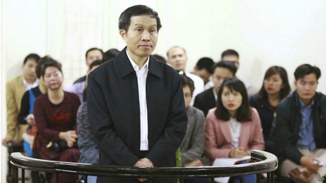 Nhà báo Nguyễn Hữu Vinh trong phiên toà sơ thẩm ngày 23/3/2016. Bà Lê Thị Minh Hà ngồi đằng sau, bên trái ảnh. Ảnh: TTXVN.