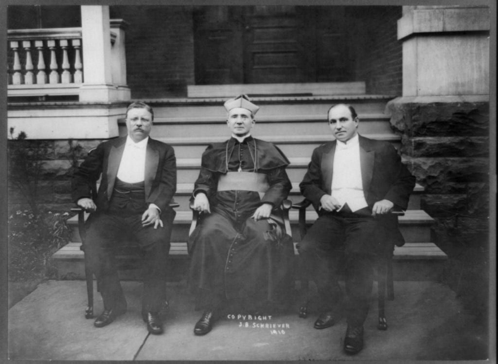 Tổng thống Theodore Roosevelt (trái) đã mở ra một chương mới trong lịch sử chính quyền Mỹ, khi kiến tạo cách xử lý hoà bình các cuộc đình công và bạo loạn trong vụ đình công năm 1902. John Mitchell (phải) cũng đi vào lịch sử như một trong những lãnh đạo công đoàn nổi tiếng nhất, cùng với cha Micheal. J. Hoban (giữa) – người ủng hộ các công nhân khai mỏ khi đó. Ảnh: Thư viện Quốc hội Mỹ.