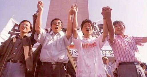 Ông Liu Xiaobo (thứ hai từ trái sang) cùng với ba người bạn đã tham gia tuyệt thực tại Thiên An Môn. Ảnh: AP.