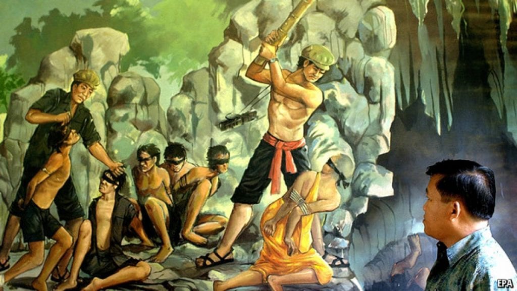 Tranh vẽ về thảm sát Cánh đồng chết ở Cambodia sau khi Khmer Đỏ nắm quyền. Ảnh: The Economist.