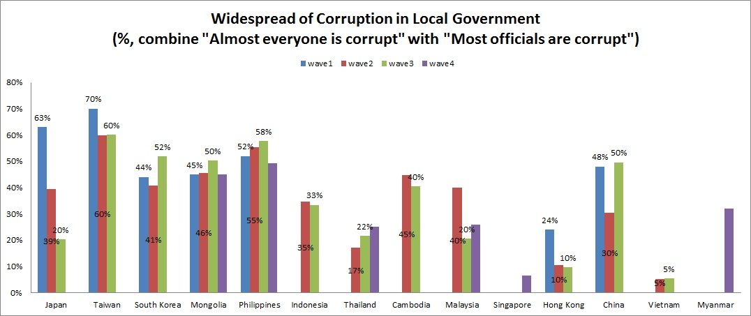 Tỷ lệ dân chúng tin rằng quan chức trong bộ máy chính quyền địa phương phần lớn là tham nhũng (Ảnh: Asian Barometer)