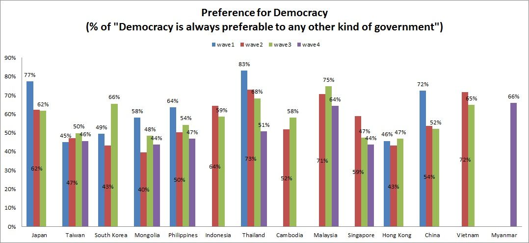 Một kết quả khảo sát quan trọng khác về mức độ ưa thích dân chủ (preference for democracy) cho thấy từ đợt 3 (khảo sát năm 2010) sang đợt 4 (khảo sát năm 2015), mức độ ưa thích dân chủ tại Việt Nam giảm 7% từ 72% xuống 65% nhưng vẫn ở mức đa số: