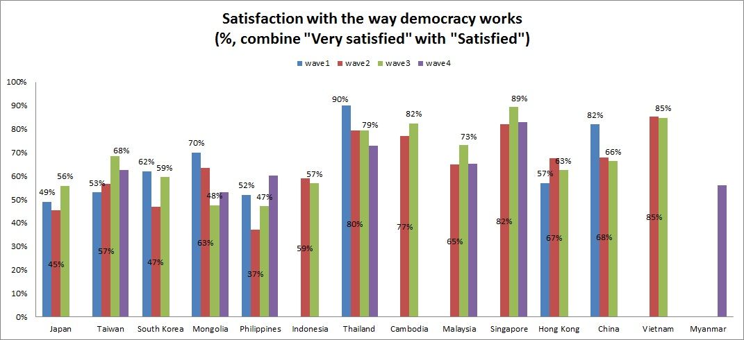 Trong kết quả khảo sát về mức độ “hài lòng” (satisfied) với tình trạng dân chủ của nước mình, người Việt Nam cho thấy một sự lạc quan chỉ thua kém Thái Lan và Singapore. 85% người được khảo sát cho biết họ hài lòng với tình trạng dân chủ trong nước: