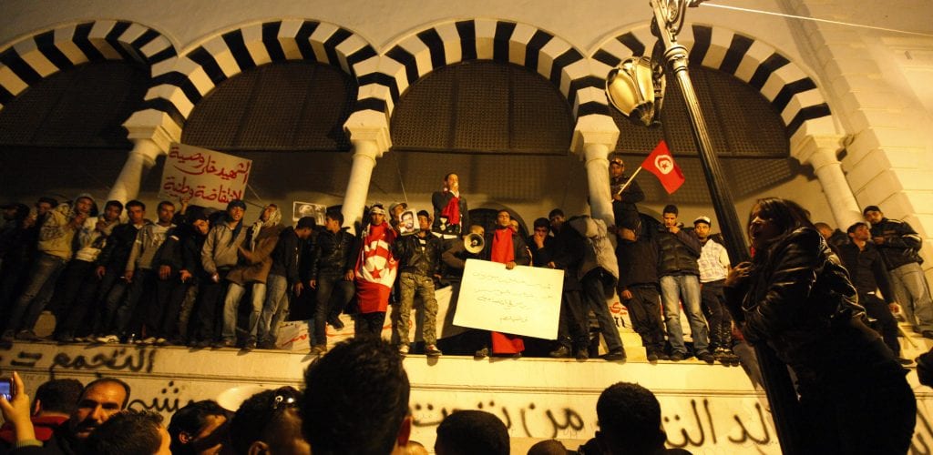 Những người biểu tình từ khu vực nông thôn Tunisia đang hô khẩu hiệu bên ngoài văn phòng Thủ tướng chính phủ, 2011. Ảnh: Zohra Bensemra/Reuters.