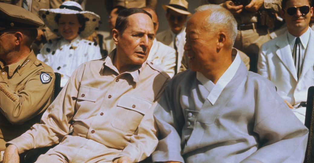 Tổng thống Hàn Quốc Rhee Syngman (phải) cùng tướng Douglas MacArthur – người chỉ huy lực lượng quân sự Mỹ trong Chiến tranh Triều Tiên. Ảnh: History.com