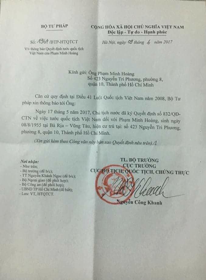 Tờ quyết định tước quốc tịch của ông Phạm Minh Hoàng dài vỏn vẹn một trang: