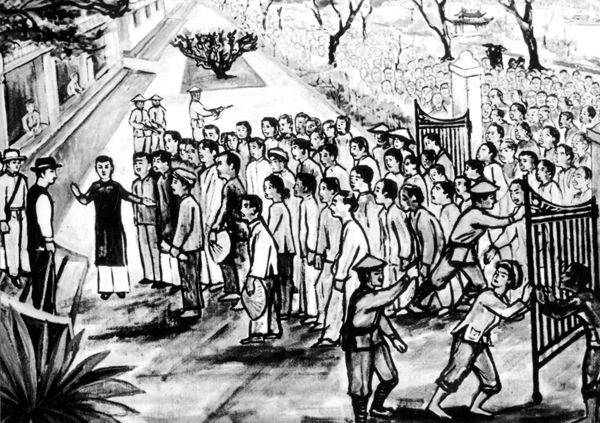 Tranh minh hoạ phong trào biểu tình kháng thuế ở Trung Kỳ năm 1908. Nguồn: hiec.org.vn.