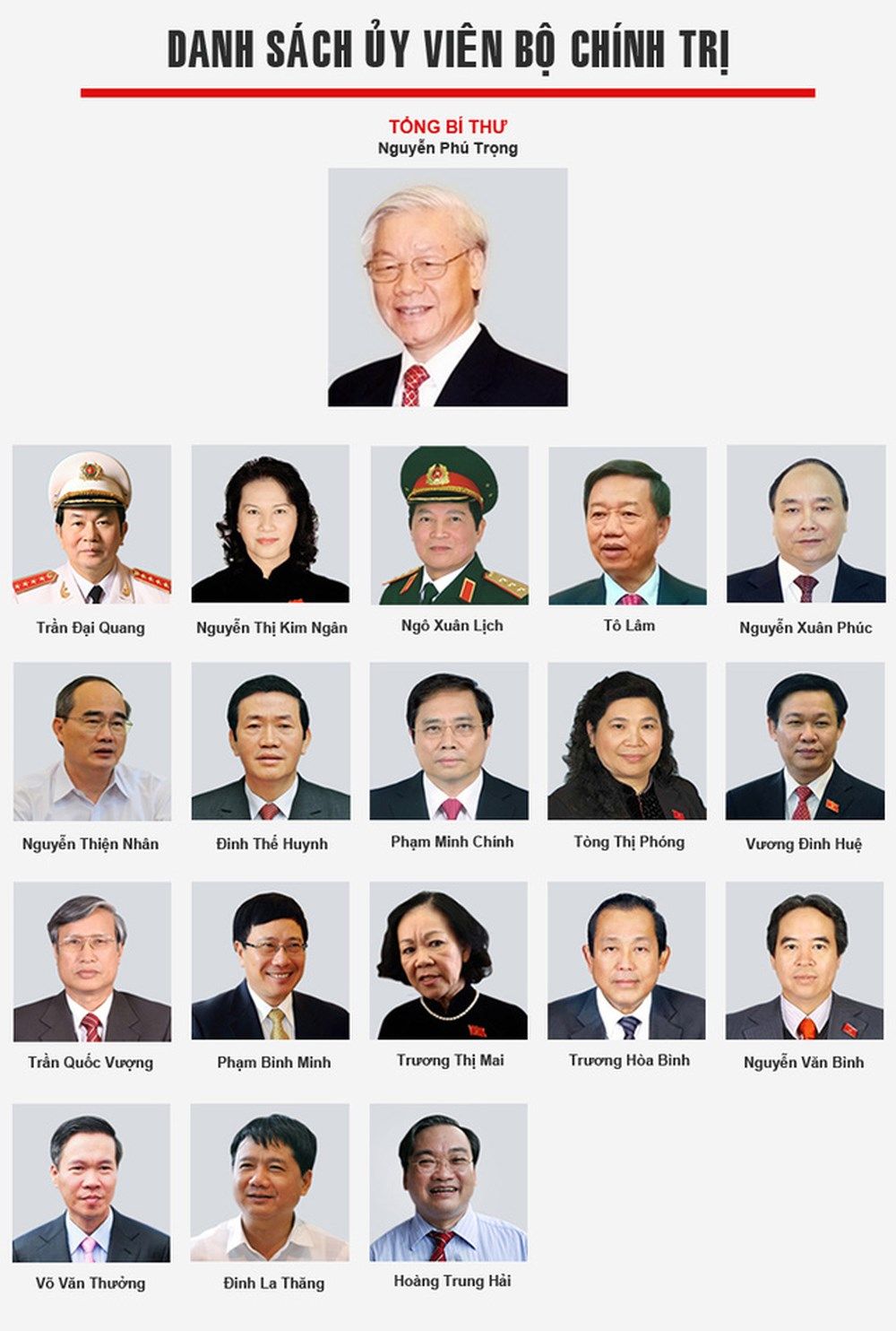 Danh sách Uỷ viên Bộ Chính trị. Lưu ý: ông Đinh La Thăng đã bị cách chức và ông Trần Đại Quang đã qua đời. Ảnh: Báo Mới.