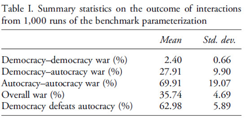 Cân nhắc sự khác biệt giữa các quốc gia có thể chế dân chủ (democracy) và nhà nước chuyên chế (autocracy), thống kê cho thấy tương tác và tranh chấp giữa các quốc gia dân chủ chỉ có 2,4% khả năng dẫn đến chiến tranh. Giữa dân chủ và chuyên chế thì tỷ lệ này ở mức 27,91%. Chức quán quân “hiếu chiến” thuộc về tranh chấp và tương tác xung đột giữa các chính phủ hoàn toàn chuyên chế, với con số 69,91%.