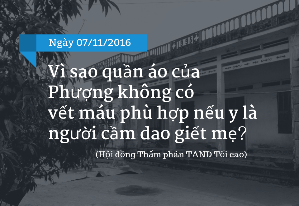 Hội đồng Thẩm phán thắc mắc vì sao bà Vui bị chém vào cổ, máu phun rất nhiều nhưng trên bộ quần áo của Phượng lại không có vết máu phù hợp.[3]