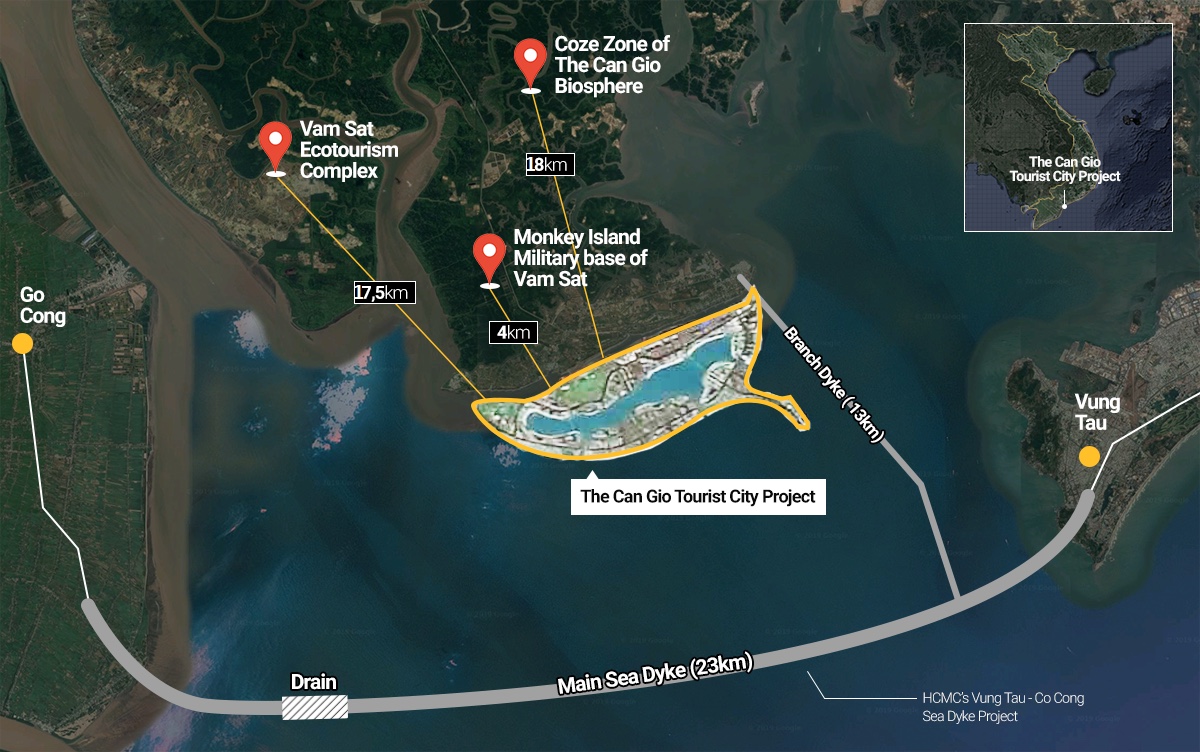 Khu đô thị du lịch lấn biển Cần Giờ chỉ cách Khu dự trữ sinh quyển rừng ngập mặn Cần Giờ (di sản được UNESCO công nhận) 18 km. Khu dự trữ sinh quyển này vốn là “lá phổi xanh” bảo vệ TP.HCM – trung tâm thương mại của cả nước – khỏi ô nhiễm đô thị và bão lũ, và làm giảm tốc độ sụt lún đất. Hệ sinh thái rừng ngập mặn Cần Giờ còn góp phần tích cực trong phân hủy nước thải từ các thành phố thượng nguồn, điều hòa nước lưu vực của các cửa sông đổ ra biển; chức năng môi trường này có ý nghĩa sống còn đối với TP.HCM và khu vực ĐBSCL.