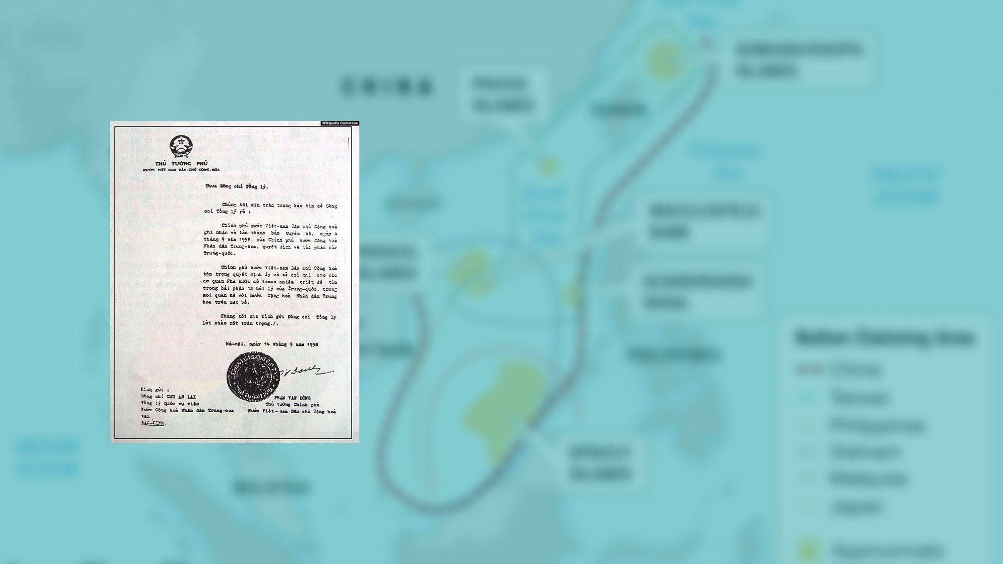 Nói dễ hiểu, tôi chấp nhận tuyên bố chủ quyền của anh. Nhưng vào năm 1958, tôi chỉ biết anh đang chiếm một số đảo tại Hoàng Sa và một số đảo tại Trường Sa, và chỉ có thể thừa nhận anh có chủ quyền tại những đảo này thôi.