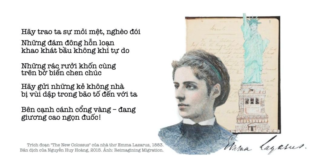 Năm 1886, Pháp tặng cho Mỹ tượng Nữ thần Tự do để kỉ niệm liên minh Pháp – Mỹ trong Cách mạng Mỹ. Bức tượng này đã trở thành biểu tượng sâu sắc của những người nhập cư. Bài thơ “The New Colossus” (Bức tượng mới) của nhà thơ Emma Lazarus được khắc trên tấm bệ đồng của bức tượng. Đó là lời chào mừng những người nhập cư tới Hoa Kỳ.