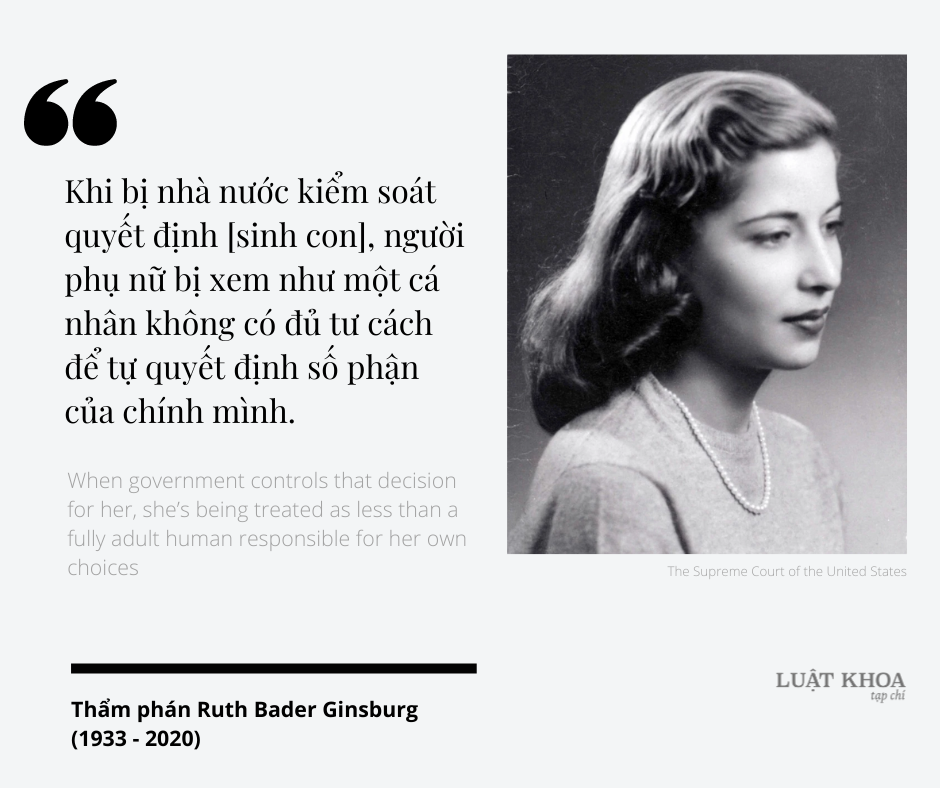 “Quyền sinh con (abortion right) (*) là thứ quan trọng bậc nhất trong cuộc đời, ảnh hưởng đến vận mệnh và phẩm giá của một người phụ nữ. Nó là quyết định của riêng mỗi người phụ nữ, do họ tự đưa ra. Khi bị nhà nước kiểm soát quyết định [sinh con], người phụ nữ bị xem như một cá nhân không có đủ tư cách để tự quyết định số phận của chính mình.”