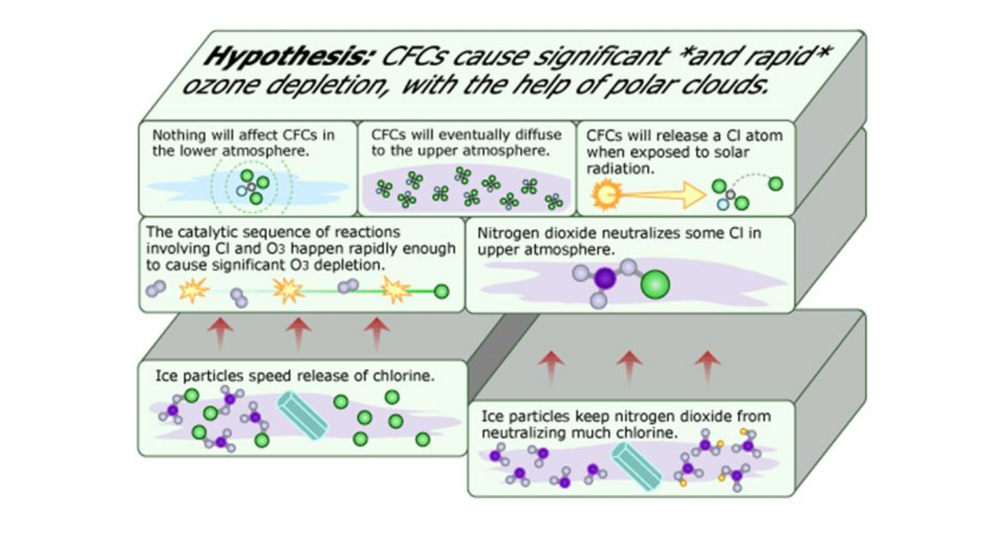 Nếu điều này là đúng, theo thời gian, lượng CFC này sẽ di chuyển lên tầng bình lưu. Tại đây, theo kết luận của Rowland và Molina, dưới tác động của bức xạ tia cực tím, CFC sẽ chuyển hoá thành hợp chất fluorine và chlorine, từ đó góp phần phá hủy ozone.
