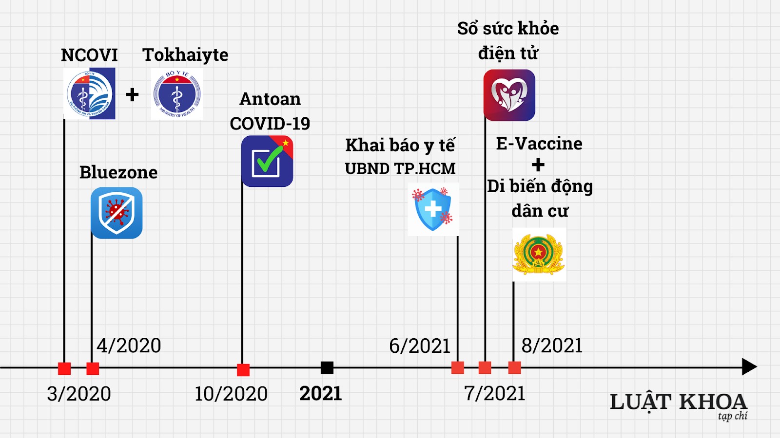 Việc phát triển các ứng dụng đến nay tạm chia thành hai phe. Bộ Y tế và Bộ TT-TT về một phe với Bluezone, NCOVI, Vietnam Heath Declaration hay Tokhaiyte, Sổ Sức khỏe Điện tử và Antoan Covid. Phe còn lại là Bộ Công an với Di biến động dân cư và E-vaccine.