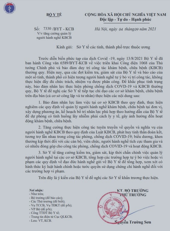Với Công văn 7330/BYT-KCB do Thứ trưởng Bộ Y tế Nguyễn Trường Sơn gửi đến các tỉnh thành về việc tăng cường “quản lý” người hành nghề khám chữa bệnh, phía đại diện Bộ Y tế khẳng định các Sở phải “giám sát, kịp thời chấn chỉnh việc quản lý người hành nghề tại các cơ sở KBCB”. [2][3]
