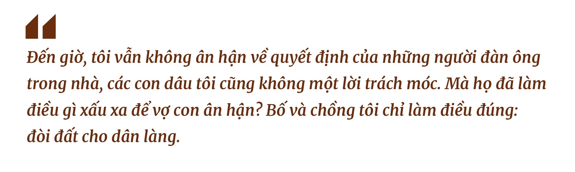 Tôi nhớ, bố chồng hay nói: mình biết có sai phạm mà không làm gì là có tội với dân. Đến giờ, tôi vẫn không ân hận về quyết định của những người đàn ông trong nhà, các con dâu tôi cũng không một lời trách móc. Mà họ đã làm điều gì xấu xa để vợ con ân hận? Bố và chồng tôi chỉ làm điều đúng: đòi đất cho dân làng.