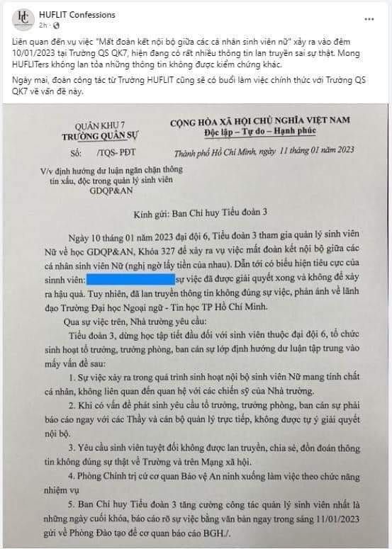 Ngay từ đầu, khi sự việc lan truyền với tốc độ chóng mặt vào tối ngày 11/1/2023, Trường Quân sự Quân khu 7 và Trường HUFLIT đã xử lý khủng hoảng bằng một loạt động tác quen thuộc: ra một công văn đơn giản để phản bác, mời công an vào cuộc để xử lý, xóa các bài đăng và dọa sinh viên không được tự ý phát biểu bình luận. Đội ngũ dư luận viên thì được huy động để tấn công ào ạt các bài viết chia sẻ về vụ việc.