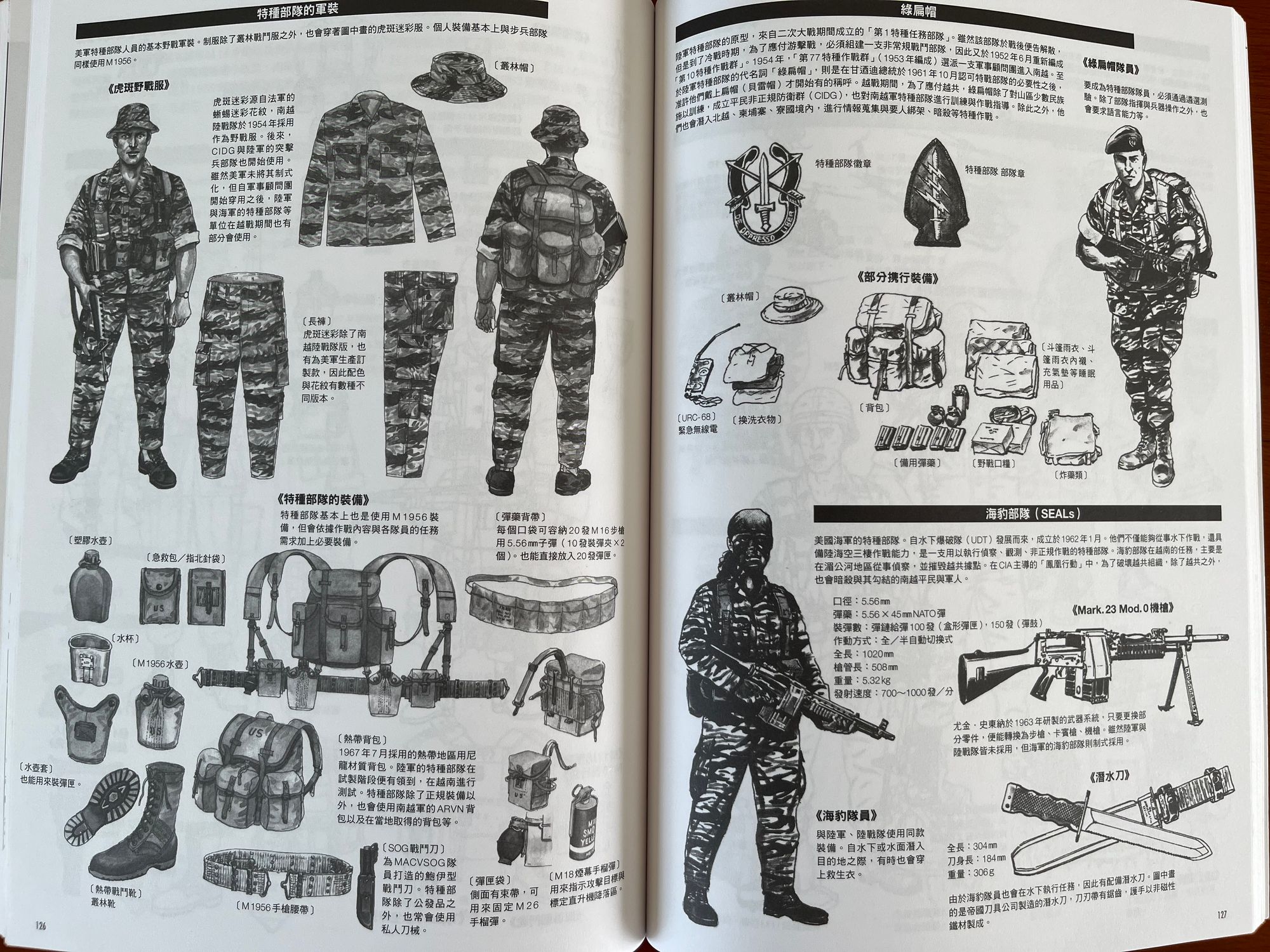 Ngoài ra, cuốn sách vẽ rất chi tiết về tất cả các quân trang của các đơn vị thuộc các bên tham chiến, như áo chống đạn, mũ, mặt nạ, ba-lô, giày, bộ đàm, v.v. Trong đó, đồng phục của bộ đội Bắc Việt được thiết kế gần giống với quân đội Trung Hoa cộng sản, cho đến năm 1980 thì mới được thay đổi.