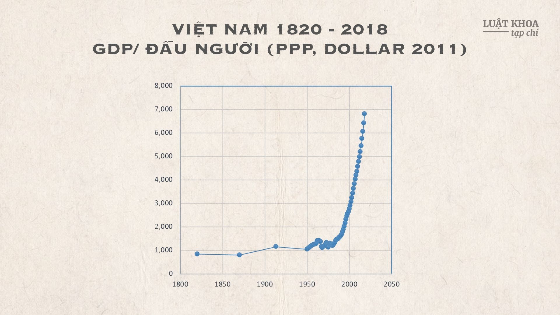 Đáng tiếc, chưa có những nghiên cứu lịch sử về vấn đề này ở Việt Nam, chí ít từ thế kỷ XIX cho đến giữa thế kỷ XX (các nhà nghiên cứu trẻ có thể dựa vào các tài liệu lưu trữ của Pháp may ra có thể dựng lại lịch sử phát triển kinh tế của Việt Nam trong giai đoạn này). Vì thế chúng tôi phải chọn một biến đại diện (proxy variable) là GDP/đầu người tính theo sức mua (PPP) với giá trị đô-la một năm cố định nào đó (để tiện so sánh). Theo Madisson Project, dữ liệu về GDP/đầu người (PPP, theo đô-la 2011) của Việt Nam từ 1820 đến 2018 diễn biến như sau.