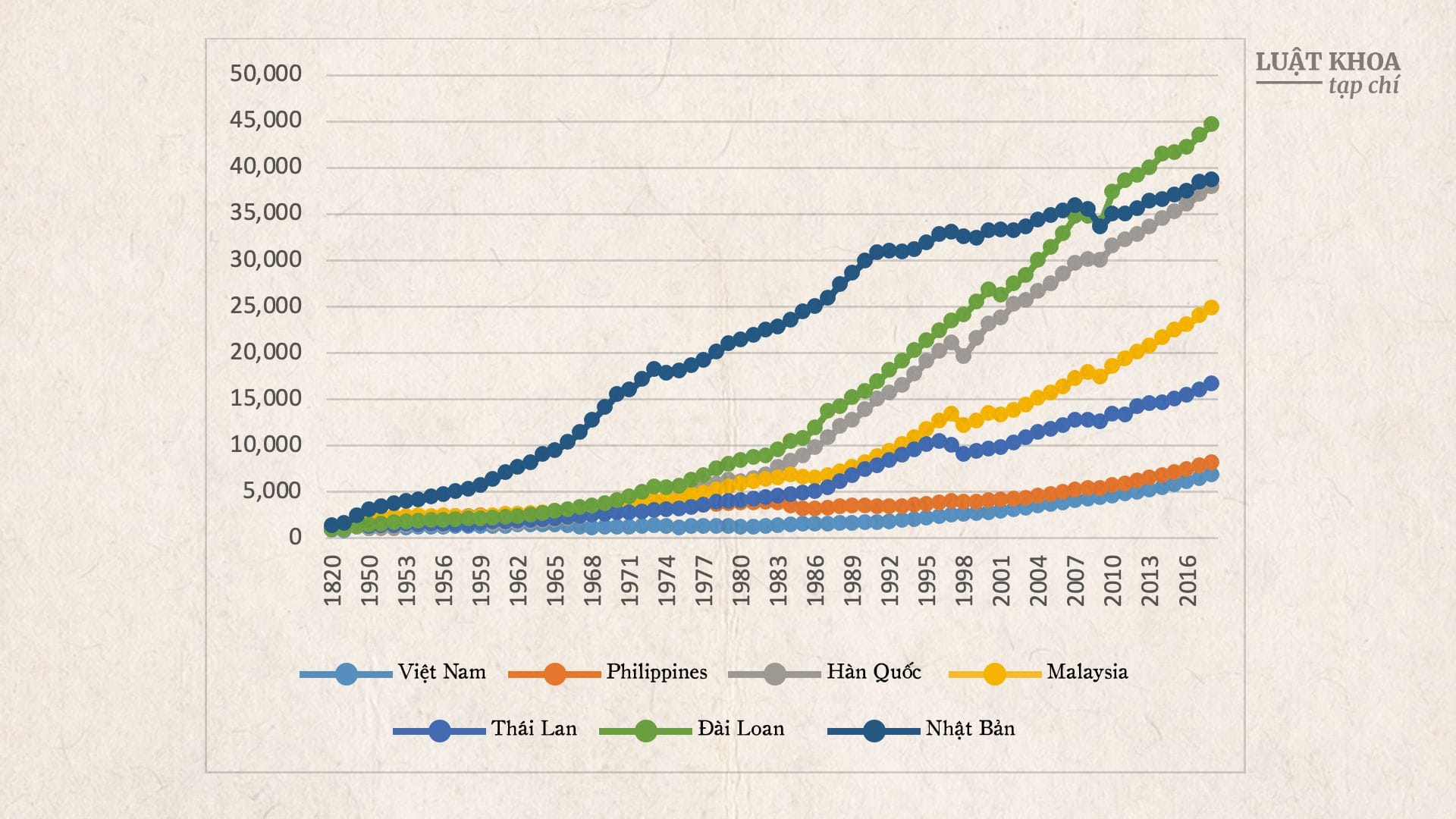 Cũng thật đáng lưu ý từ Hình 3 rằng xuất phát điểm của tất cả các nước này vào năm 1820 là gần như nhau: Nhật – $1.321, Đài Loan – $966; Malaysia – $960; Philippines – $931; Thái Lan – $909 và Việt Nam $840. Đến đầu thế kỷ XX vẫn đại thể như vậy (trừ Nhật Bản) với GDP/đầu người năm 1913 là $1.159 ở Việt Nam, $1.171 ở Hàn Quốc, $1.286 ở Đài Loan; $1.289 ở Malaysia; $1.341 ở Thái Lan; $1.575 ở Philippines, và $2.431 ở Nhật Bản. Nhưng, từ những năm 1950-1960 trở đi, sự phân kỳ là hết sức rõ rệt do những lựa chọn khác nhau của mỗi nước.