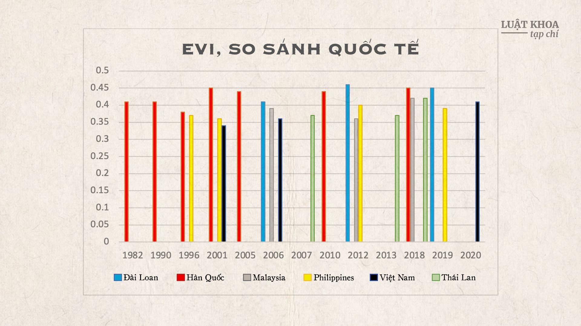 Hãy xem xét EVI của vài nước trong khu vực để chúng ta có thể có chút cơ sở nào đó để mường tượng. Do các giá trị thường được thiết lập trong các năm hình thành (formative years, 0-8 tuổi; và môi trường kinh tế xã hội và nhất là môi trường gia đình, giáo dục ở tuổi trước khi đến trường và trong thời vị thành niên là hết sức quan trọng) và các giá trị của toàn xã hội (tức mức trung bình phổ biến của giá trị nào đó) thay đổi chủ yếu qua sự thay thế các nhóm tuổi, cho nên các giá trị, kể cả dân khí (EVI), thường thay đổi rất chậm.