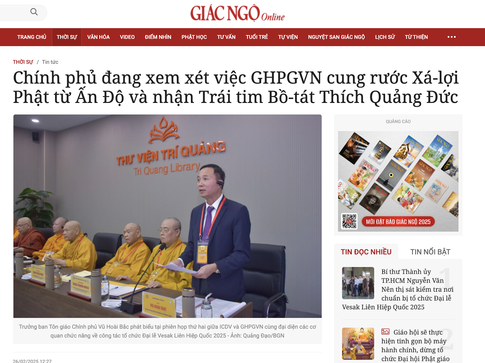 - Hồi tháng Một, Trung ương Giáo hội Phật giáo Việt Nam (GHPGVN)đã thông báo về kế hoạch thỉnh xá lợi Phật, nhận được sự hỗ trợ của Chính phủ và Bộ Ngoại giao trong quá trình đàm phán với phía Ấn Độ.
