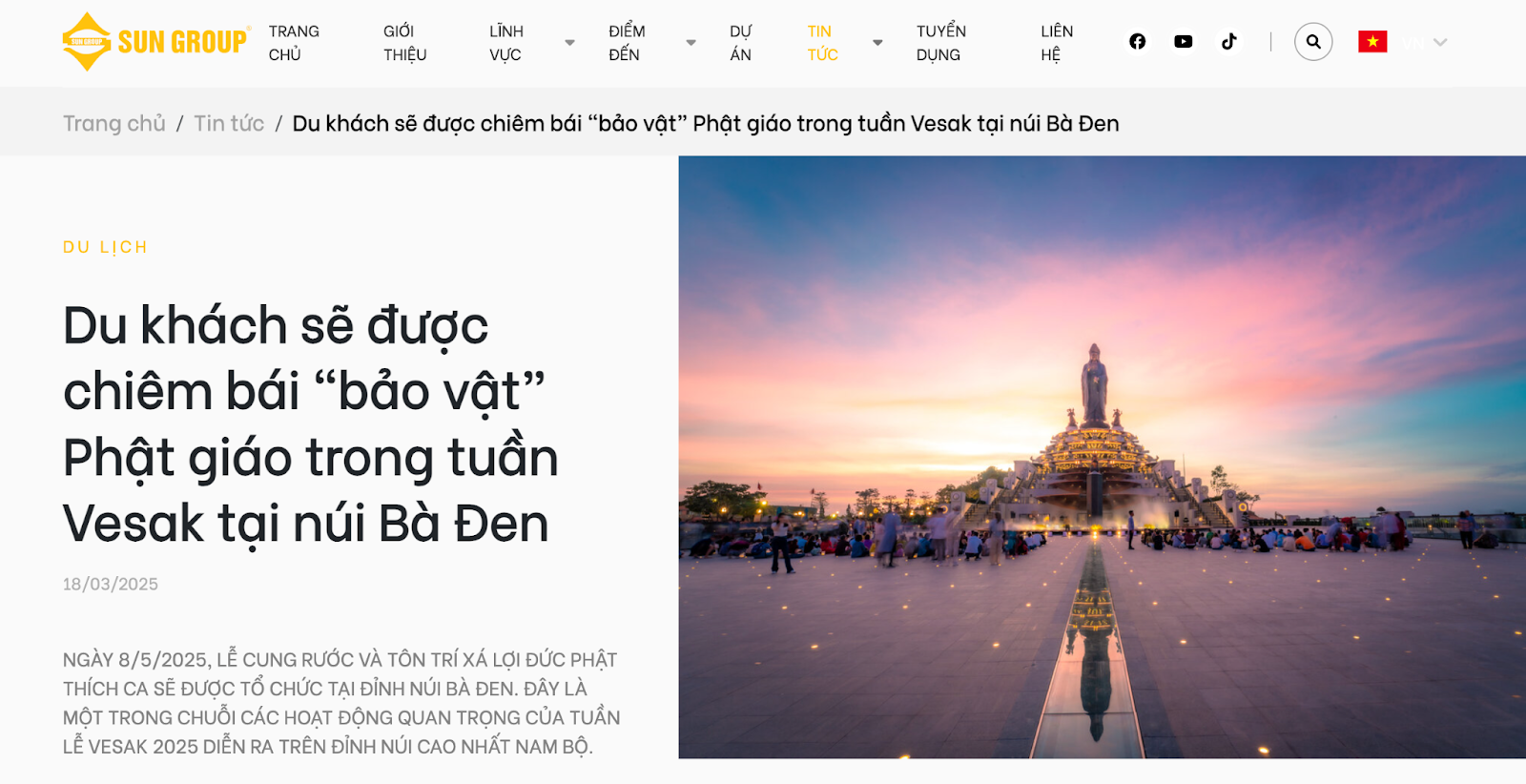 - Trong thông báo chính thức, Sun Group quảng bá hình ảnh địa điểm tổ chức Vesak, khẳng định toàn bộ không gian đảnh lễ và chiêm bái sẽ diễn ra trong không gian thuộc khu du lịch Sun World Ba Den Mountain.