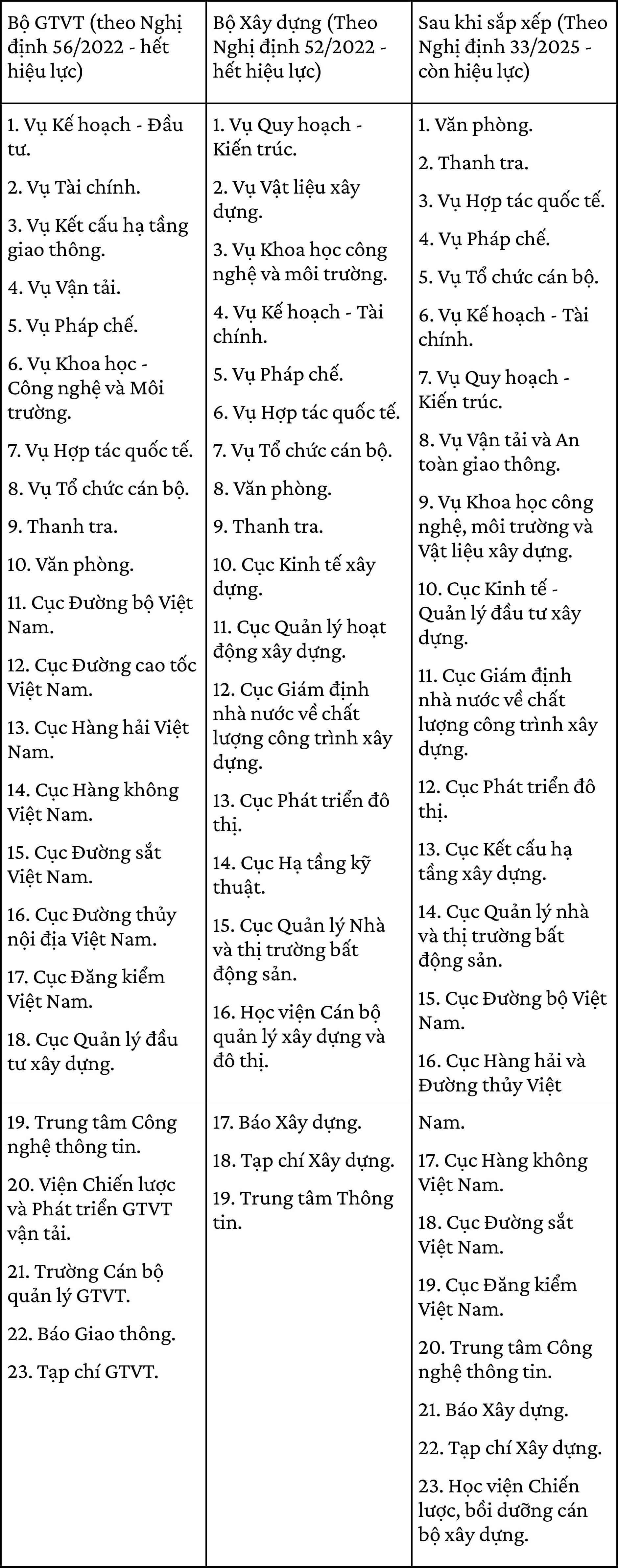 Trước khi hợp nhất, hai bộ có tổng cộng 42 đơn vị, trong đó Bộ GTVT có 23 đơn vị, Bộ Xây dựng có 19 đơn vị (xem bảng dưới đây).