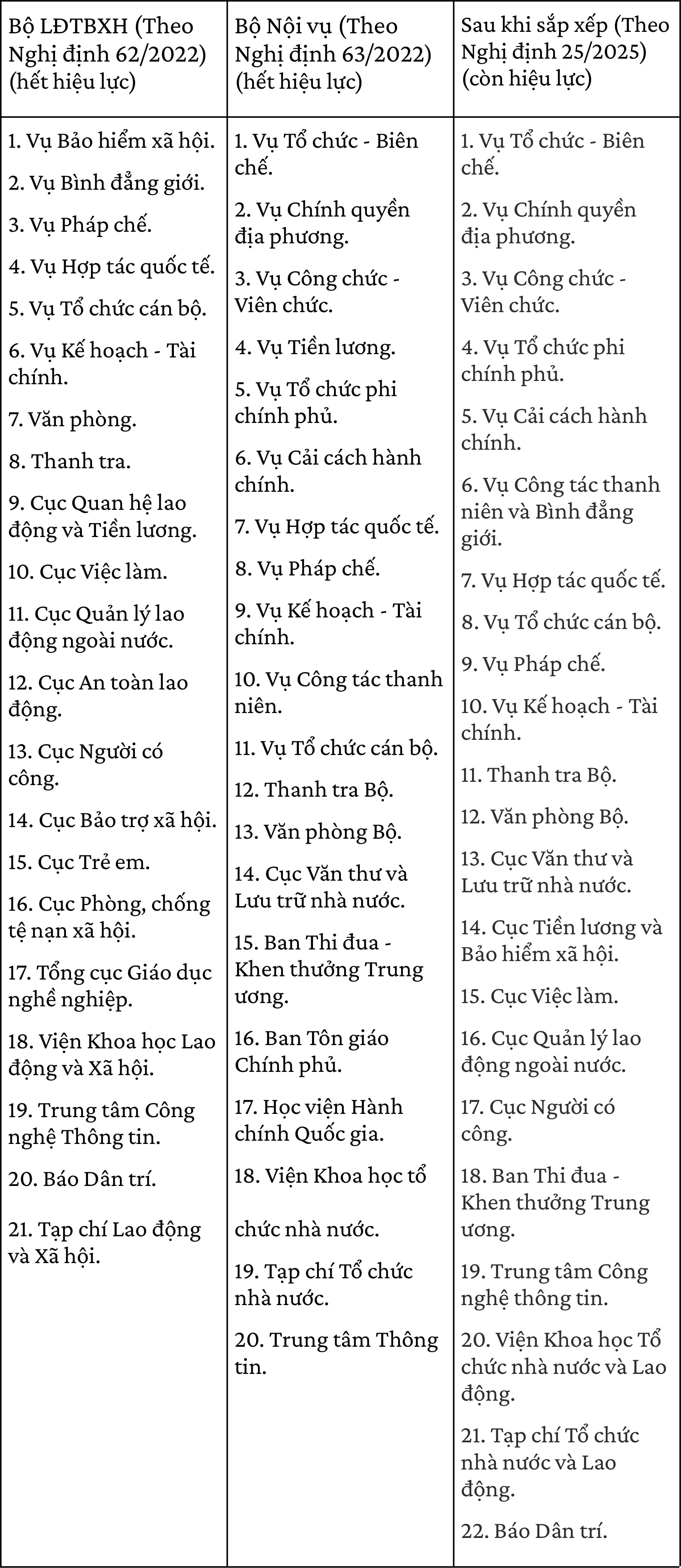 Trong đó: 29 nhiệm vụ sẽ bàn giao cho Bộ Nội vụ; Tổng cục Giáo dục nghề nghiệp, ba trường đại học (Sư phạm Kỹ thuật Vinh, Nam Định, Vĩnh Long) cùng 14 đơn vị liên quan khác chuyển sang Bộ Giáo dục và Đào tạo; các đơn vị như Cục Trẻ em, Cục Bảo trợ xã hội, Cục Phòng chống tệ nạn xã hội sẽ chuyển về Bộ Y tế (xem bảng dưới đây).