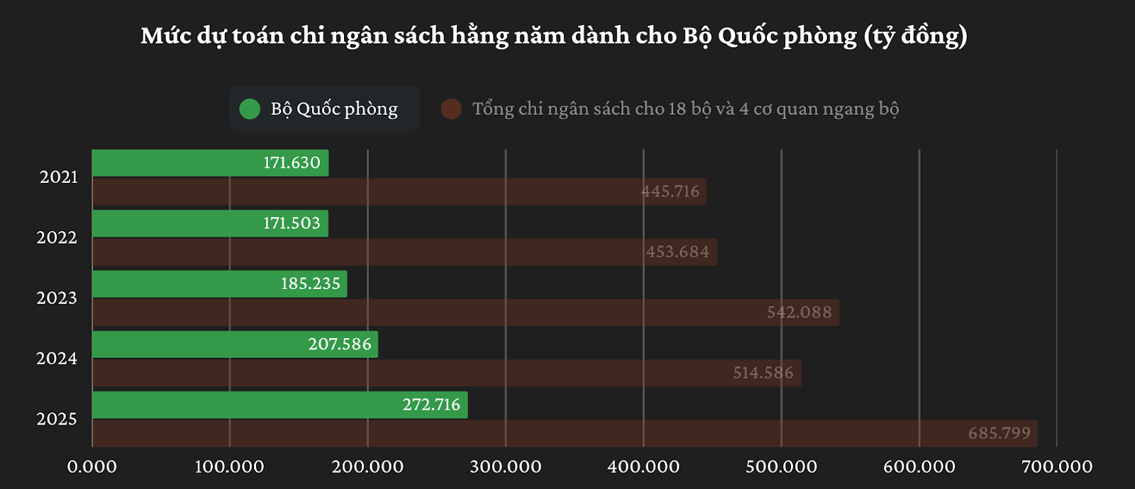 Năm 2025, mức chi cho Bộ Quốc phòng tăng lên 272.716 tỷ đồng, tăng gần 60% (tức hơn 101.086 tỷ đồng) so với năm 2021.