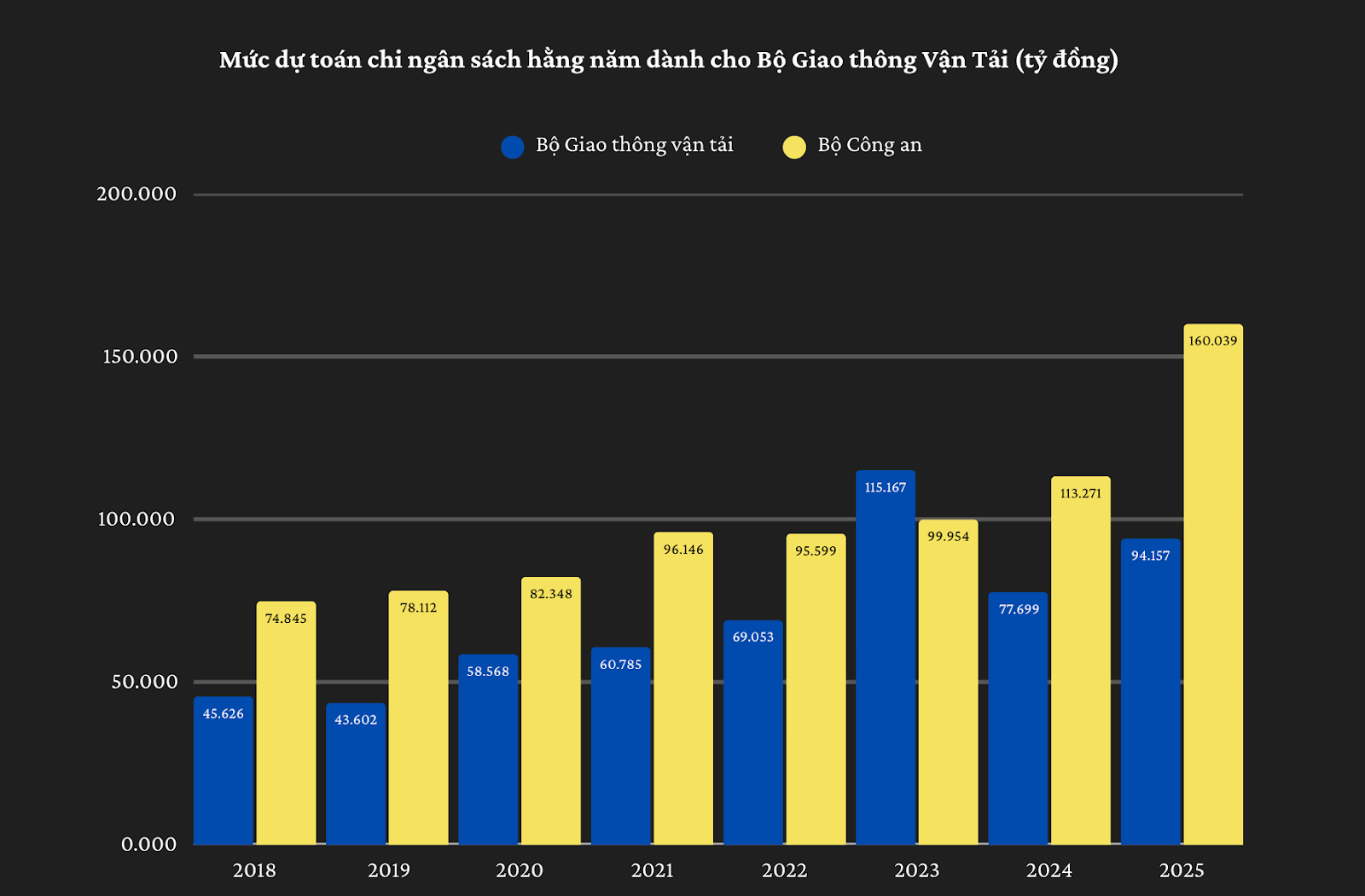 Từ năm 2021 – 2025, ngân sách nhà nước đã chi cho Bộ GTVT tổng cộng là 416.861 tỷ đồng, với mức phân bổ từng năm lần lượt là 60.785 – 69.053 – 115.167 – 77.699 – 94.157 tỷ đồng.