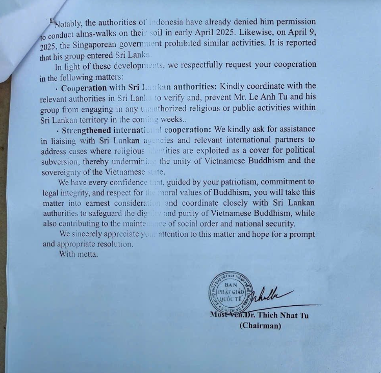 - Theo đó, văn bản này được gửi đi từ ngày 13/4, do Hòa thượng Thích Nhật Từ ký và có đóng dấu của Ban Phật giáo Quốc tế, thuộc GHPGVN TP. HCM.