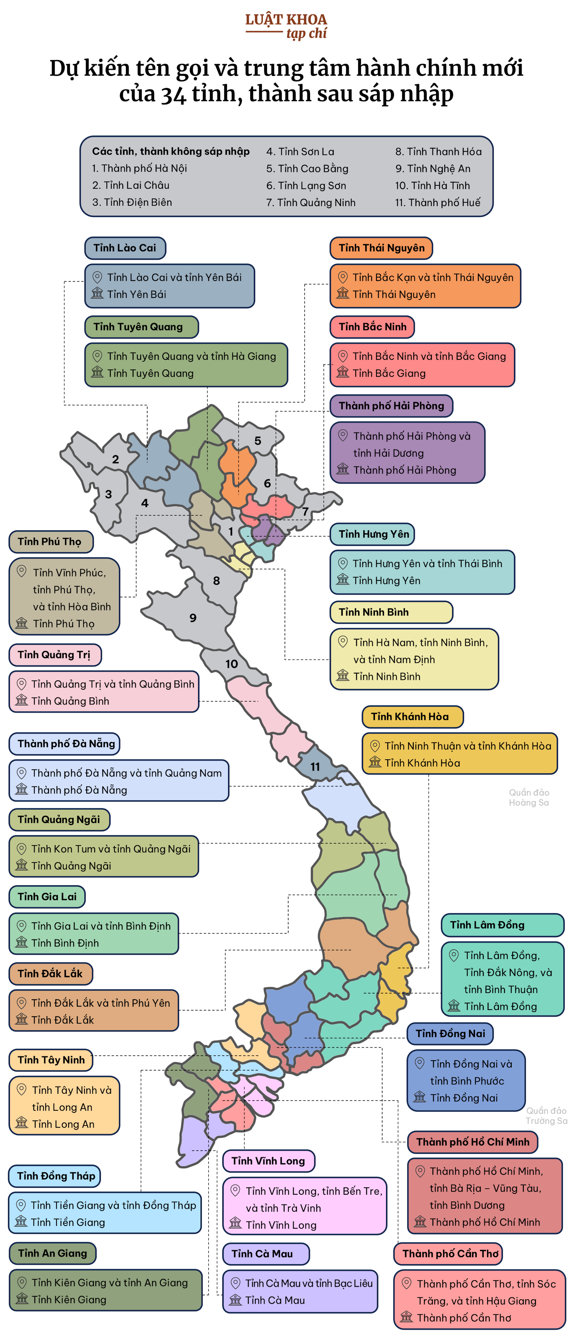 - Sau sáp nhập, cả nước sẽ có 34 tỉnh, thành, trong đó có 28 tỉnh và sáu thành phố trực thuộc trung ương. Chỉ có 11 tỉnh, thành không bị sáp nhập vào địa phương khác.