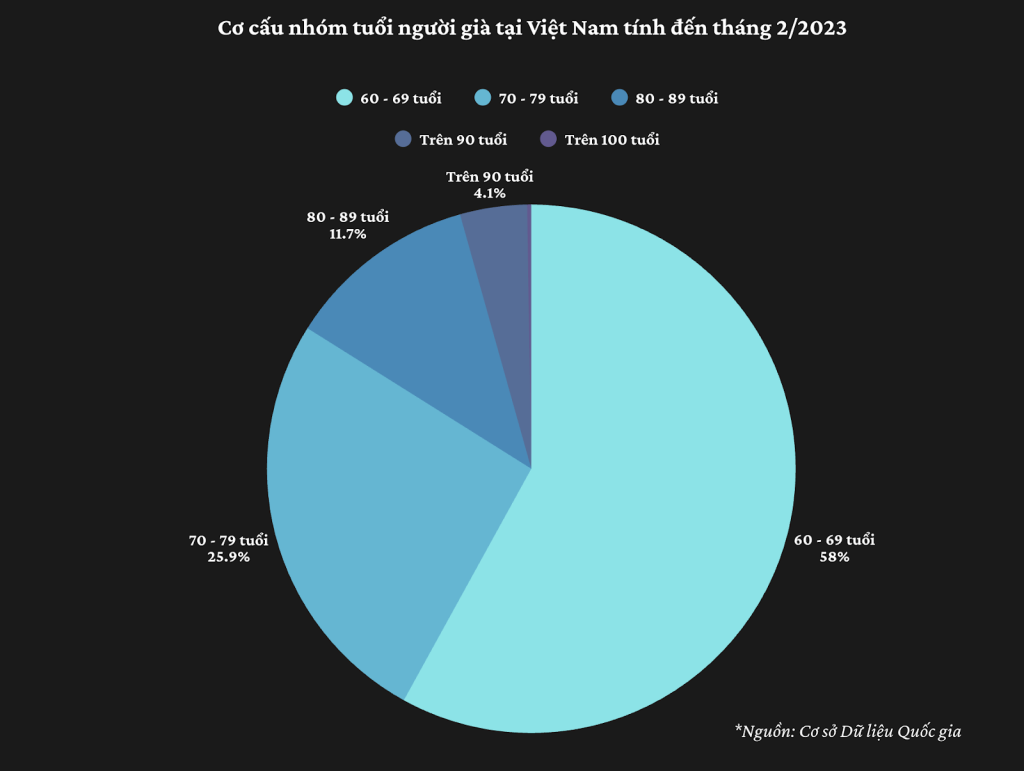 Trong đó, nhóm từ 60 – 69 tuổi chiếm tỷ lệ cao nhất (hơn 9,4 triệu người), tiếp đến là nhóm 70 – 79 tuổi (4,2 triệu người), nhóm 80 – 89 tuổi (gần 1,9 triệu), và nhóm trên 90 tuổi (khoảng 664.000 người), trong đó có hơn 41.000 người từ 100 tuổi trở lên.