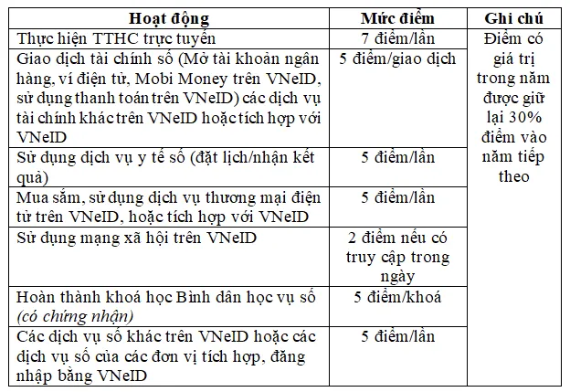 - Giao dịch tài chính, mua sắm và sử dụng mạng xã hội trên VNeID cũng được cộng điểm liên tục mỗi lần hoặc mỗi ngày.