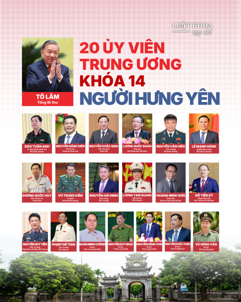 - 20 ủy viên BCHTƯ quê Hưng Yên là những lãnh đạo ở nhiều lĩnh vực trong hệ thống chính trị từ công an, quân đội đến Quốc hội, tư pháp, v.v.
