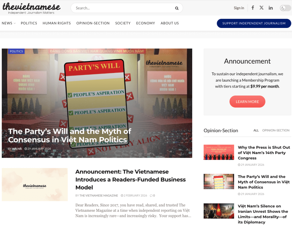 - The Vietnamese Magazine: Sau hơn tám năm miễn phí truy cập, đã đến lúc tờ tiếng Anh của Luật Khoa bắt đầu thu phí. Kể từ tháng 2/2026, The Vietnamese sẽ đặt paywall.