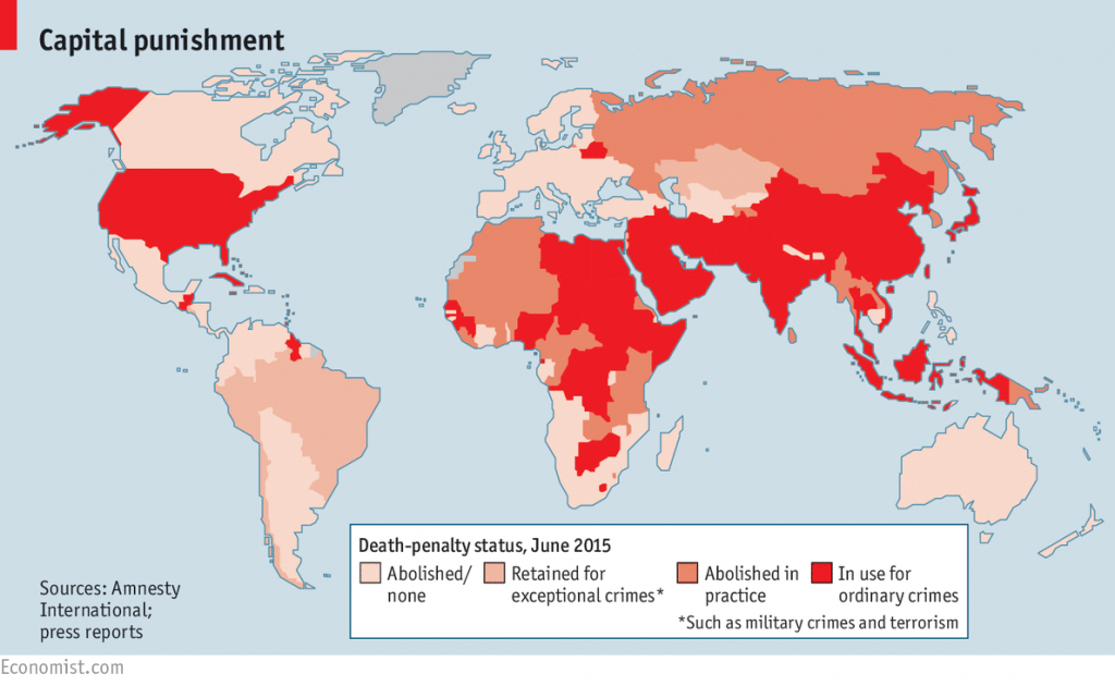 Bản đồ án tử hình thế giới tháng 6-2015. Ảnh: The Economist