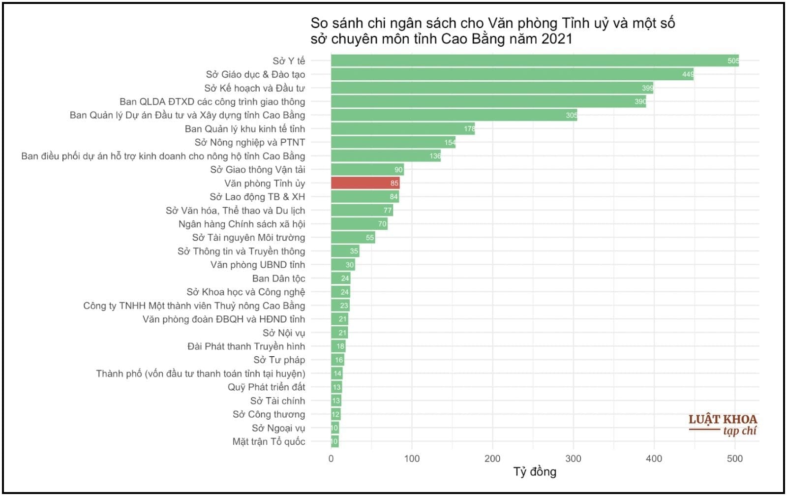 Cao Bằng là tỉnh có dân số gần thấp nhất cả nước (chỉ đứng trên hai tỉnh Lai Châu, Bắc Kạn), với hơn 542.000 người, nhưng chi cho Văn phòng Tỉnh ủy tới 85 tỷ đồng, gần với mức chi của Khánh Hòa với số dân hơn gấp đôi là 1,2 triệu người.