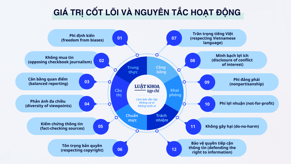 - Chuẩn mực: Mỗi sản phẩm của Luật Khoa phải đạt tiêu chuẩn cao về tính kiểm chứng, độ tin cậy và khả năng truyền đạt. Chúng tôi không lan truyền thuyết âm mưu hay nội dung tuyên truyền, mà xây dựng nội dung từ dữ liệu điều tra, nghiên cứu. Chúng tôi cũng không ngừng cải thiện, nâng cao năng lực để mang đến cho độc giả những sản phẩm chất lượng nhất.