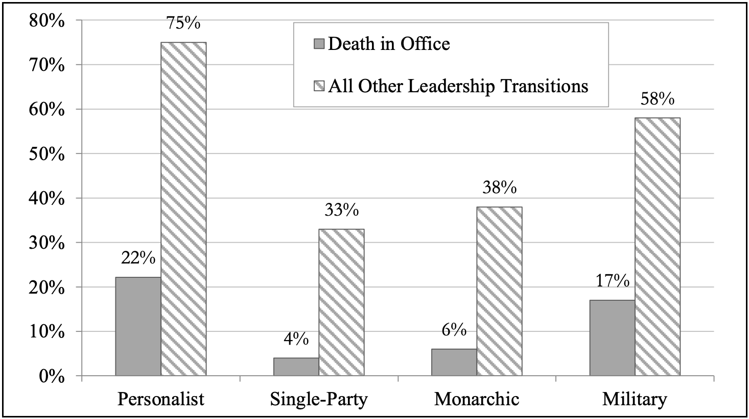 Hình trên thể hiện sự thay đổi chế độ sau khi thay đổi nhà lãnh đạo. Cột tô màu xám biểu thị thay đổi lãnh đạo chế độ do người đứng đầu chết, cột có gạch chéo biểu thị thay đổi lãnh đạo do các nguyên nhân khác. Bốn nhóm cột thể hiện bốn loại chế độ độc tài: độc tài cá nhân, độc đảng, quân chủ, và độc tài quân sự.