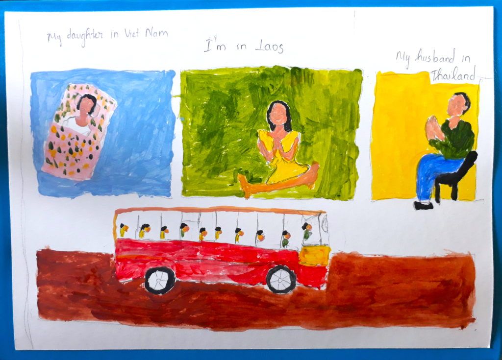 Ngồi ngay trên sàn nhà, mẹ Jen đang tô lại cảnh chị bị lạc con gái út hai tuổi ở cửa khẩu biên giới giữa Việt Nam và Lào. Để qua được cửa khẩu, chị được người dẫn đường bảo trốn trong hầm xe buýt, còn đứa con gái theo ông ta qua cửa khẩu. Đến khi qua được cửa khẩu, ra khỏi hầm xe, thì chị khóc ngất vì chẳng thấy đứa con gái và người dẫn đường ở đâu. Phải hai hôm sau, người dẫn đường mới mang đứa con gái của chị đến Lào.