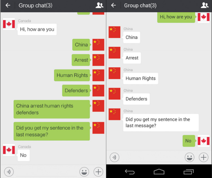 Trong cuộc trò chuyện trên WeChat giữa một người Trung Quốc và một người Canada, tin nhắn có nội dung “bắt bớ người bảo vệ nhân quyền” không hề được gửi đi. Ảnh: Citizen Lab.