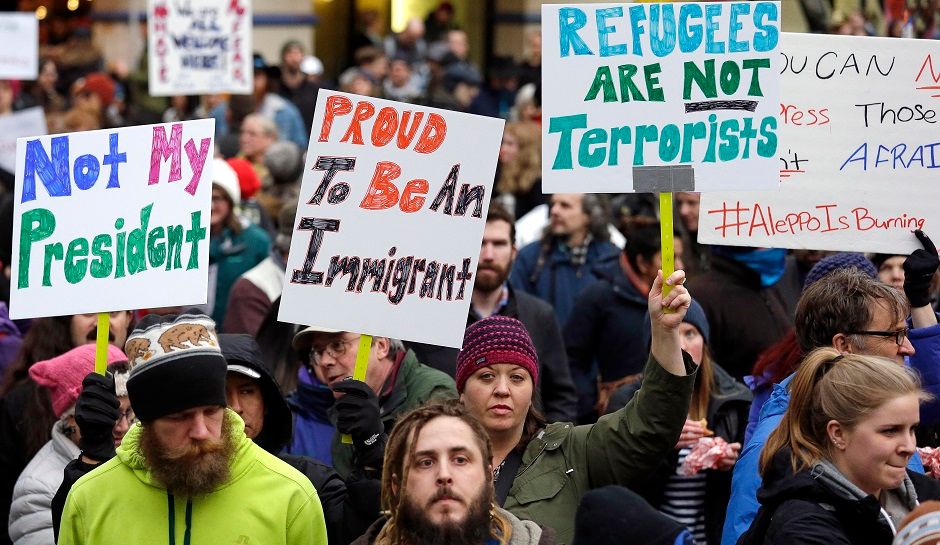 Biểu ngữ “Tự hào là một người nhập cư”, “Người tị nạn không phải khủng bố”, “Không phải Tổng thống của tôi” tại một cuộc biểu tình ngày 29/1 tại Seattle phản đối sắc lệnh cấm nhập cảnh của Tổng thống Trump. Ảnh: AP Photo/Elaine Thompson.