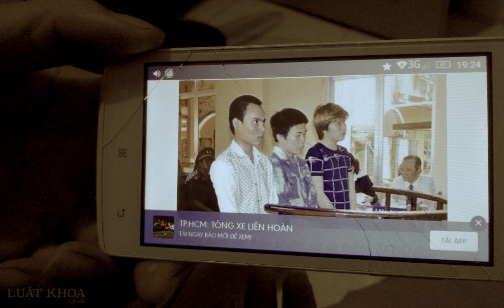 Nhựt mở lại một bức ảnh mà anh (tóc vàng) cùng với Ca (đứng giữa) và Khang trong phiên xét xử sơ thẩm đầu tiên. Ảnh: Luật Khoa tạp chí.